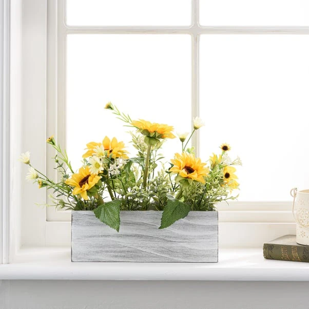 Bring the warmth of sunshine indoors with our Artificial Sunflower Bouquet in a Wooden Plant Pot. This detailed arrangement, featuring a mix of budding and blooming orange and white sunflowers, is perfect for displaying anywhere in your home. The realistic finish requires no maintenance, ensuring a vibrant and enduring burst of colour that brightens your space.
