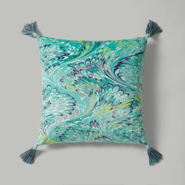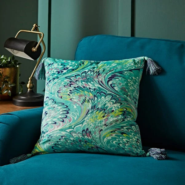 Indulge in luxury with the Feather Marble Cushion, made from sumptuous recycled velour and adorned with elegant tassel details. Complete with a zip closure and luxury feather fill, this cushion is as practical as it is beautiful. Machine washable for easy care, it’s the perfect blend of opulence and comfort.