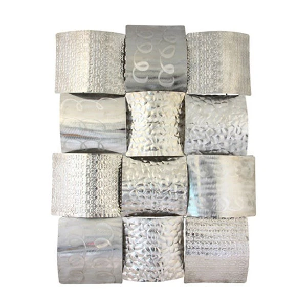 Featuring textured squares arranged to give a woven appearance, this silver metal wall art will give your room a fresh new look that will complement your existing decor. The layered effect provides plenty of angles for the surface to glint and shine in the light for a glamorous finish. Further enhanced by the variety of textures and effects on each panel, this contemporary piece of wall art will look stylish and elegant displayed in your home. An easy care wipe clean piece of artwork, this hand-made wall hanging will add a glitzy feel and makes a stylish modern alternative to a traditional print.